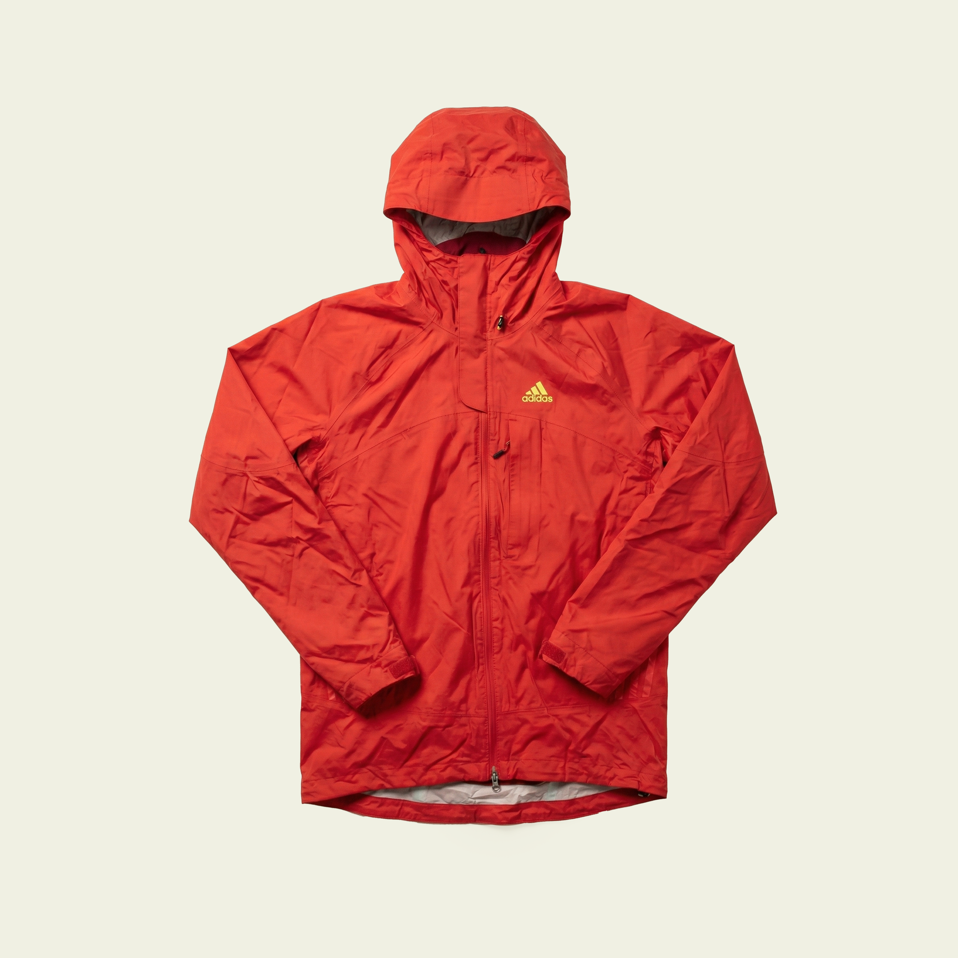 Outer Layer (Right): A waterproof/windproof hard shell (Red). You correctly identified it as likely being GORE-TEXor Climaproof (Adidas's proprietary weather tech). It features a storm hood and technical zippers.